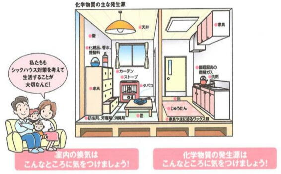 | シックハウス症候群とは、新築や改築(リフォーム)直後の室内空気汚染によって引き起こされる病気で す。室内のカビやハウスダストなどによって起こるアレルギー症状も、広い意味ではシックハウス症候群 の中に分類されますが、ここでは狭義のシックハウス症候群について説明します。 建材や建材関連品には、大量の揮発性化学物質が使われています。それらは、建材の防腐剤や接着 剤の成分として、さらにはシロアリなどの防虫剤として家のあらゆるところに使用されています。 新築やリフォーム直後の家の中に入るとツーンと鼻をつく匂いがしますが、これらの多くは放散している ホルムアルデヒドやトルエンなどの揮発性化学物質の臭気で、微量でも極めて有害な成分が含まれる 場合があります。 |